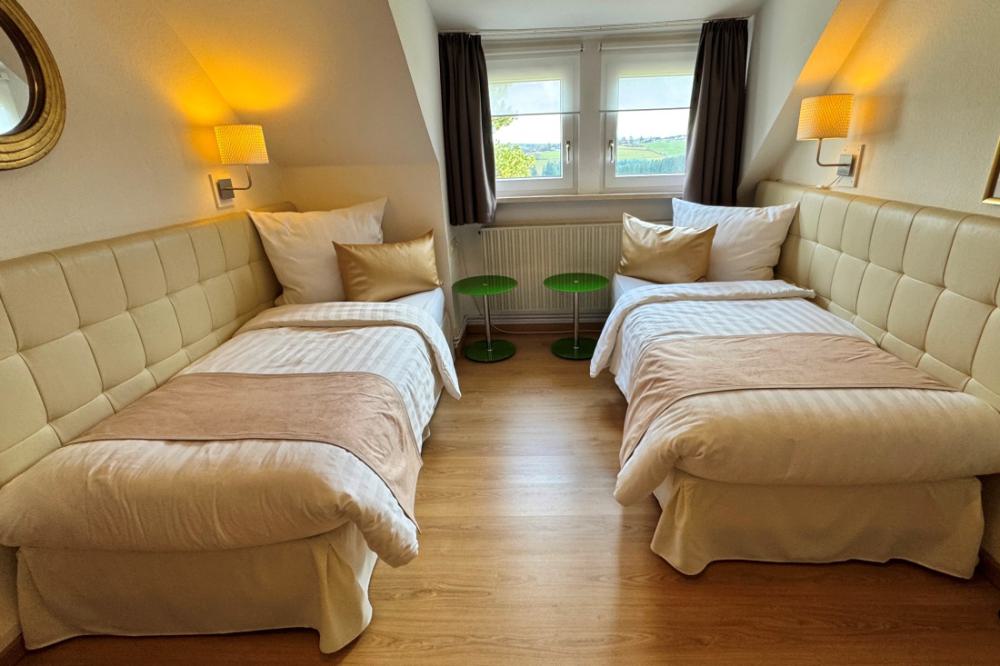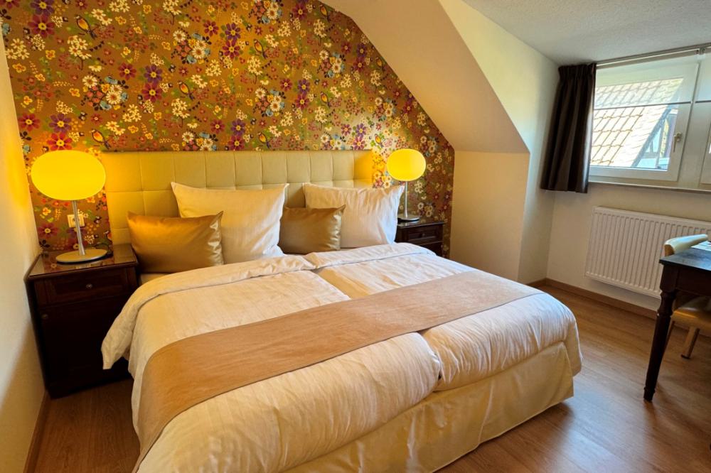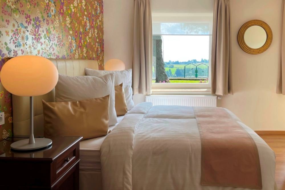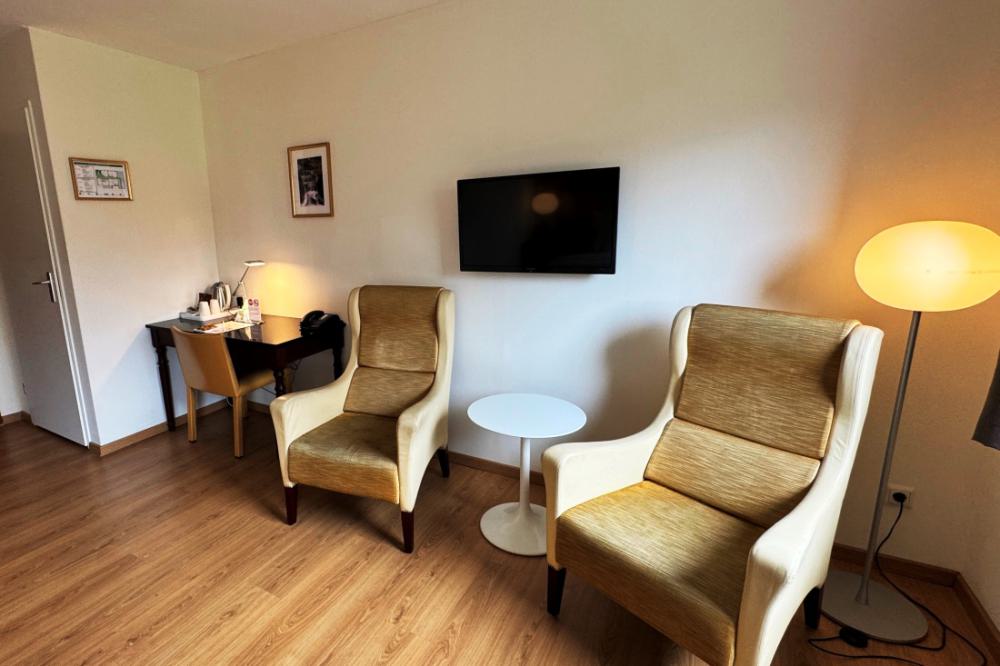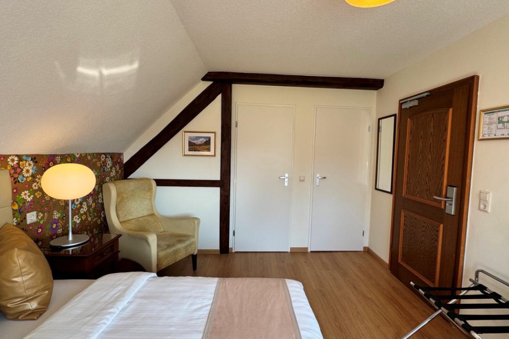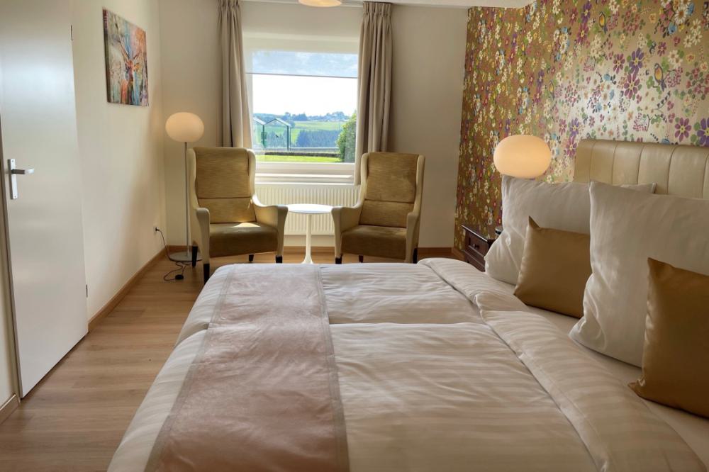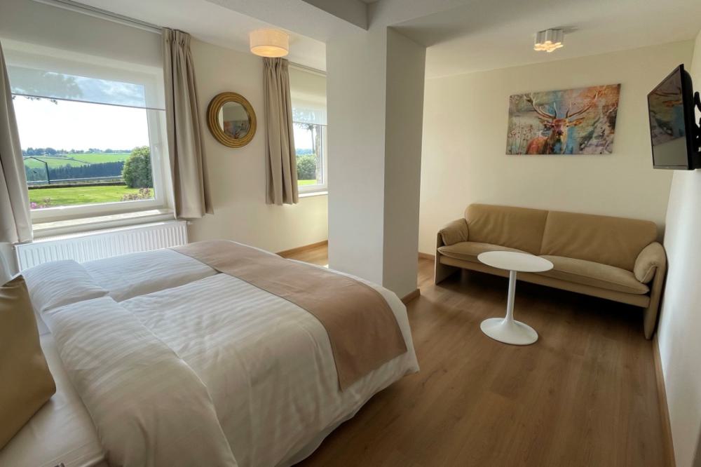 The comfort plus double rooms are comparable to the comfort rooms, but are slightly more spacious and are also equipped with a comfortable sofa. All comfort plus rooms have recently been completely renovated, are located on the ground floor and first floor and have a private bathroom with shower and toilet. The rooms are equipped with comfortable box-spring beds, a writing table, two comfortable armchairs, a sofa and coffee and tea in the room. The comfort plus double rooms have a wonderful view over the valley.