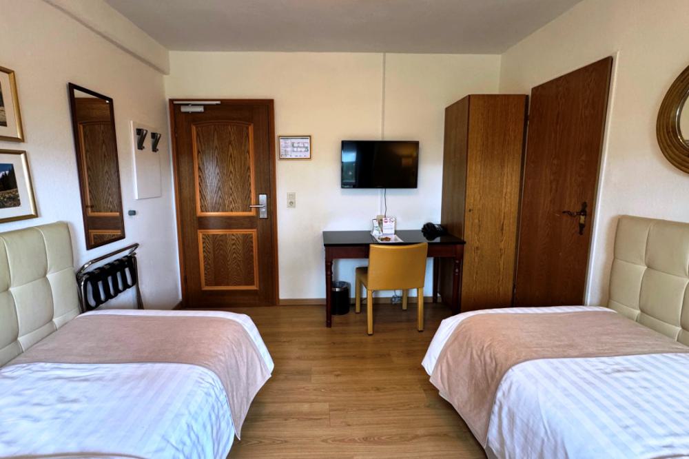 The twin rooms also are on the second floor and are equipped with two comfortable single box spring beds. These rooms are not yet renovated, are all on the second floor and all have a private bathroom with shower or bath and toilet. These rooms offer enough space for a short stay and have a magnificent view over the valley.